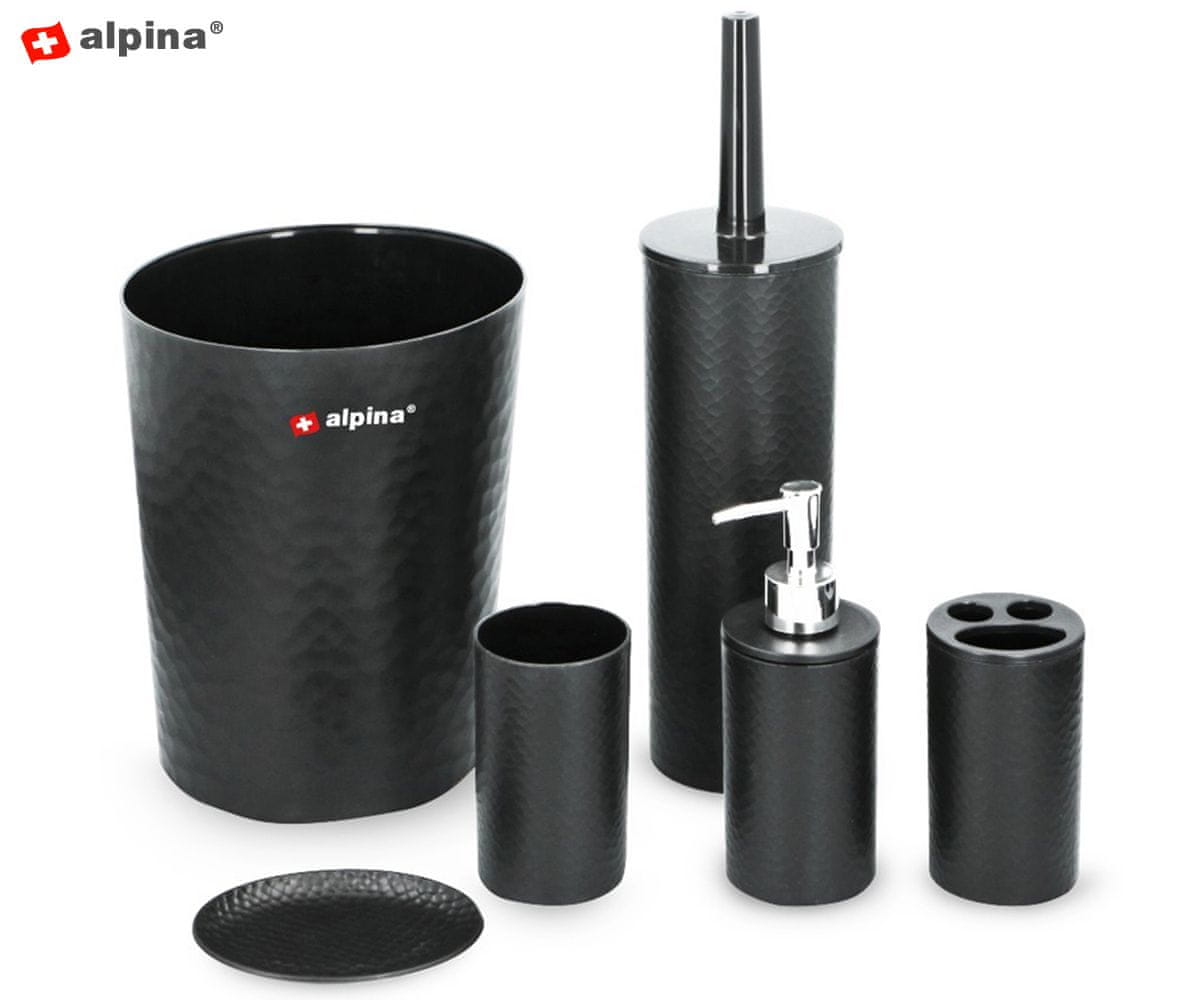 Opremite svoju kupaonicu kupaonskim setom Alpina u modernom crnom dizajnu, koji će oplemeniti vaš prostor. Set uključuje košaru za otpatke, WC četku, dozator sapuna, držač četkice za zube i šalicu.