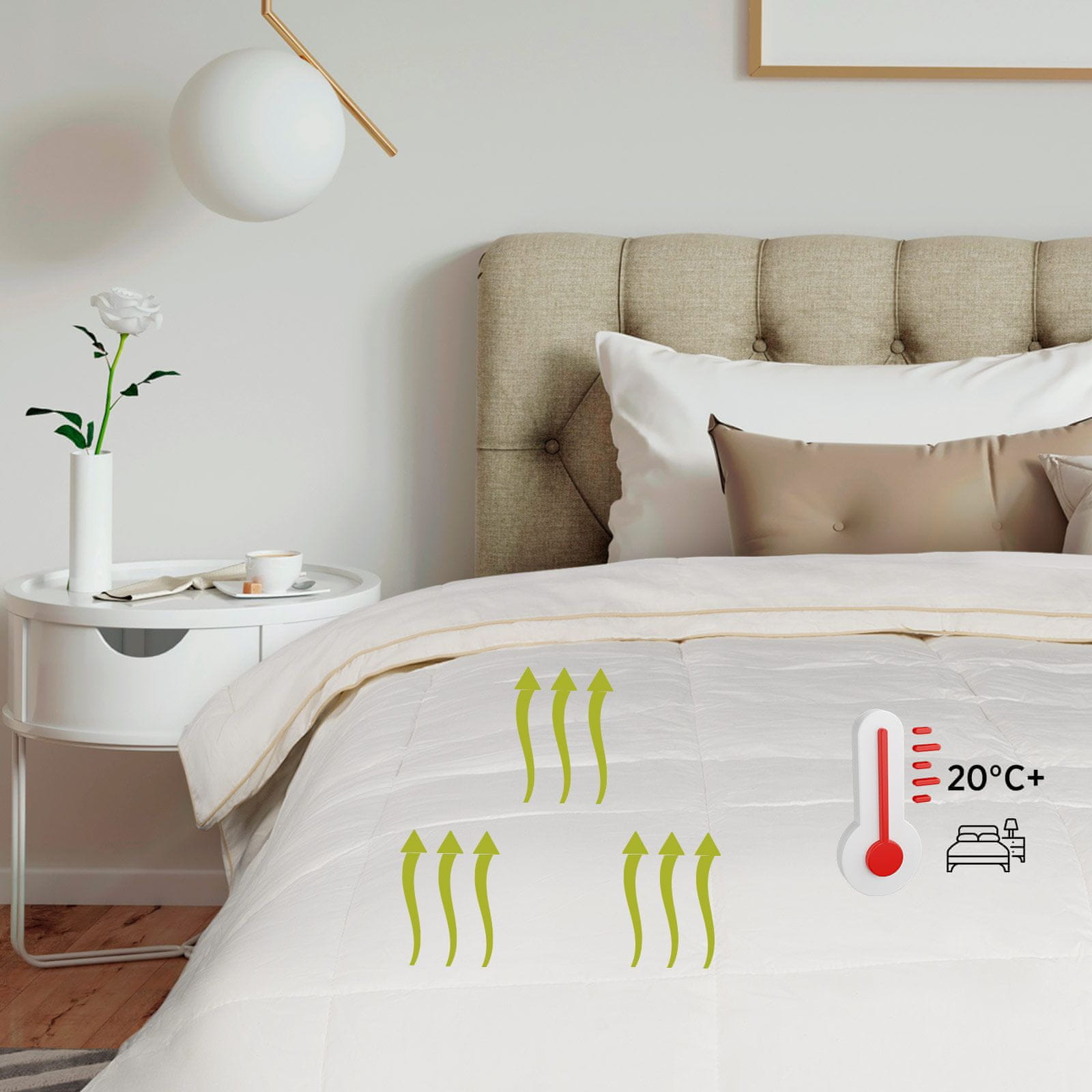 Kombinacija bambusovih vlakana i nebijeljenog pamuka daje dodatnu prozračnost. Deka diše s vama i održava idealnu temperaturu tijekom cijele noći. Savršen izbor za spavaće sobe s temperaturom iznad 20 °C.