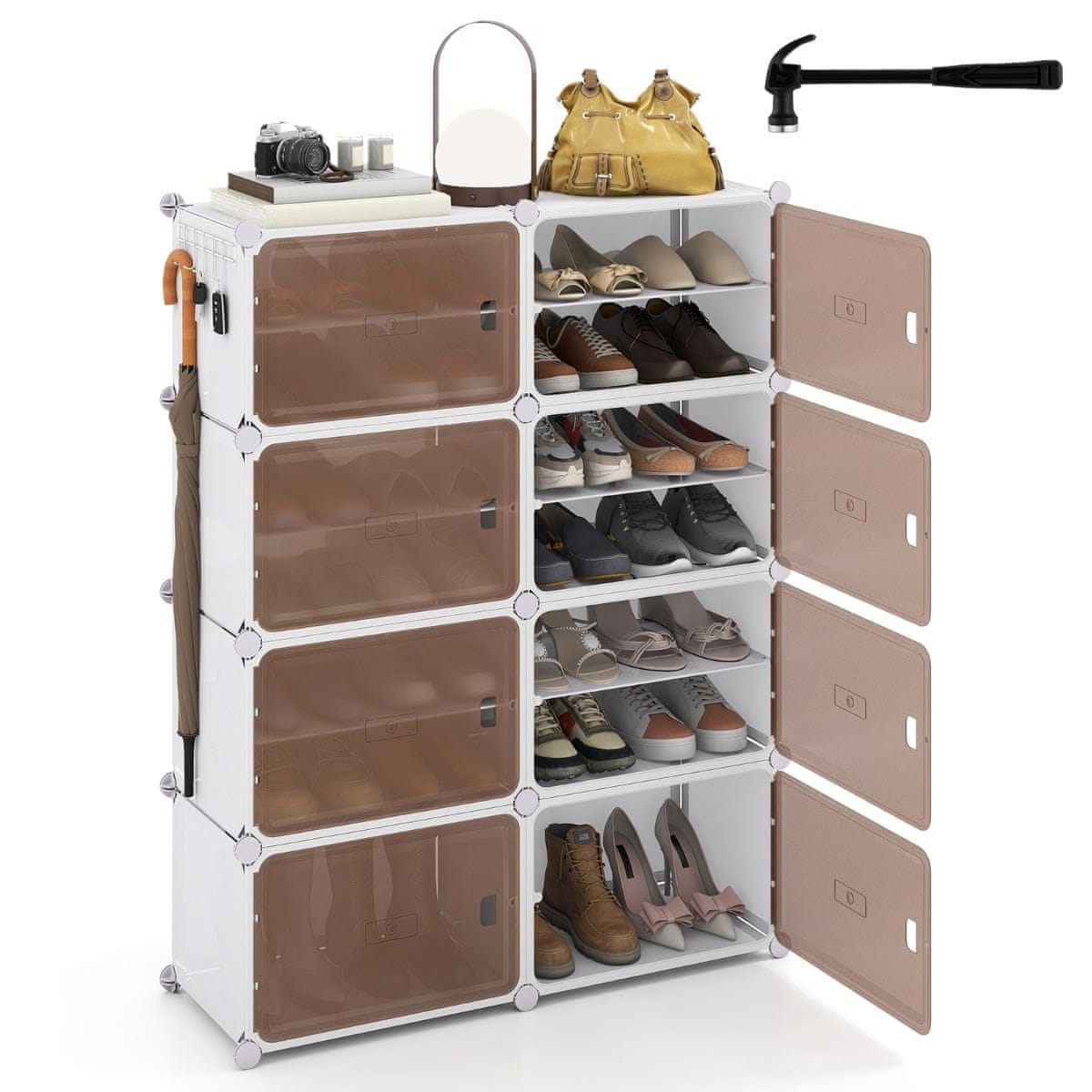 Organizirajte do 32 para cipela s ovim stalkom od 8 razina. Podesive police i magnetska vrata omogućuju prilagodbu različitim vrstama obuće, dok prozirne ploče održavaju preglednost. Stabilan metalni okvir i proširivi dizajn čine ga idealnim za hodnike, spavaće sobe ili ormare.