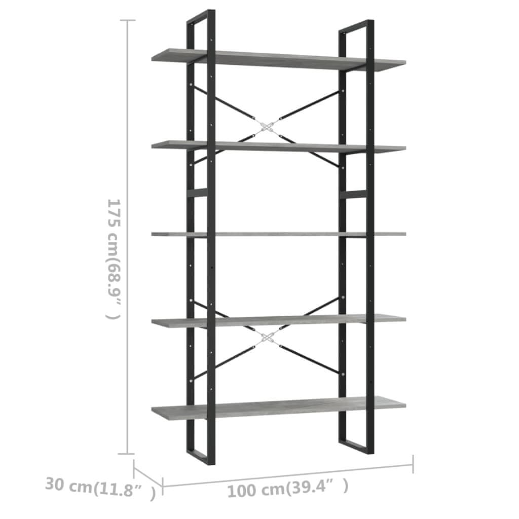 Vidaxl Ormarić za knjige s 5 razina boja betona 100x30x175 cm drveni