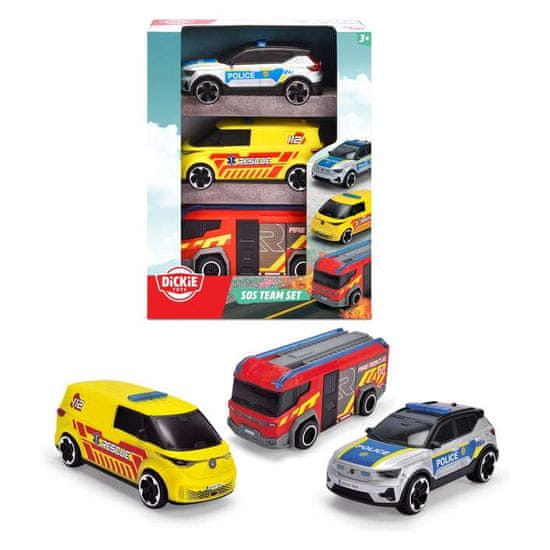 Dickie SOS tim vozila uključuje 3 vozila koja su točne licencirane replike stvarnih vozila. Ta vozila su policijski automobil Volvo EX40, vozilo hitne pomoći Buzz i vatrogasno vozilo Rosenbauer Penta. Pogodno za djecu stariju od tri godine.