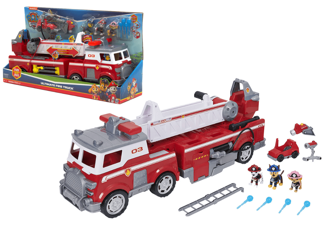 Paw Patrol vatrogasno vozilo uključuje radne ljestve, mini vatrogasno vozilo, vatrogasno crijevo na uvlačenje i figure likova Paw Patrol. Vozilo je na akumulator i ima zvučne i svjetlosne efekte.