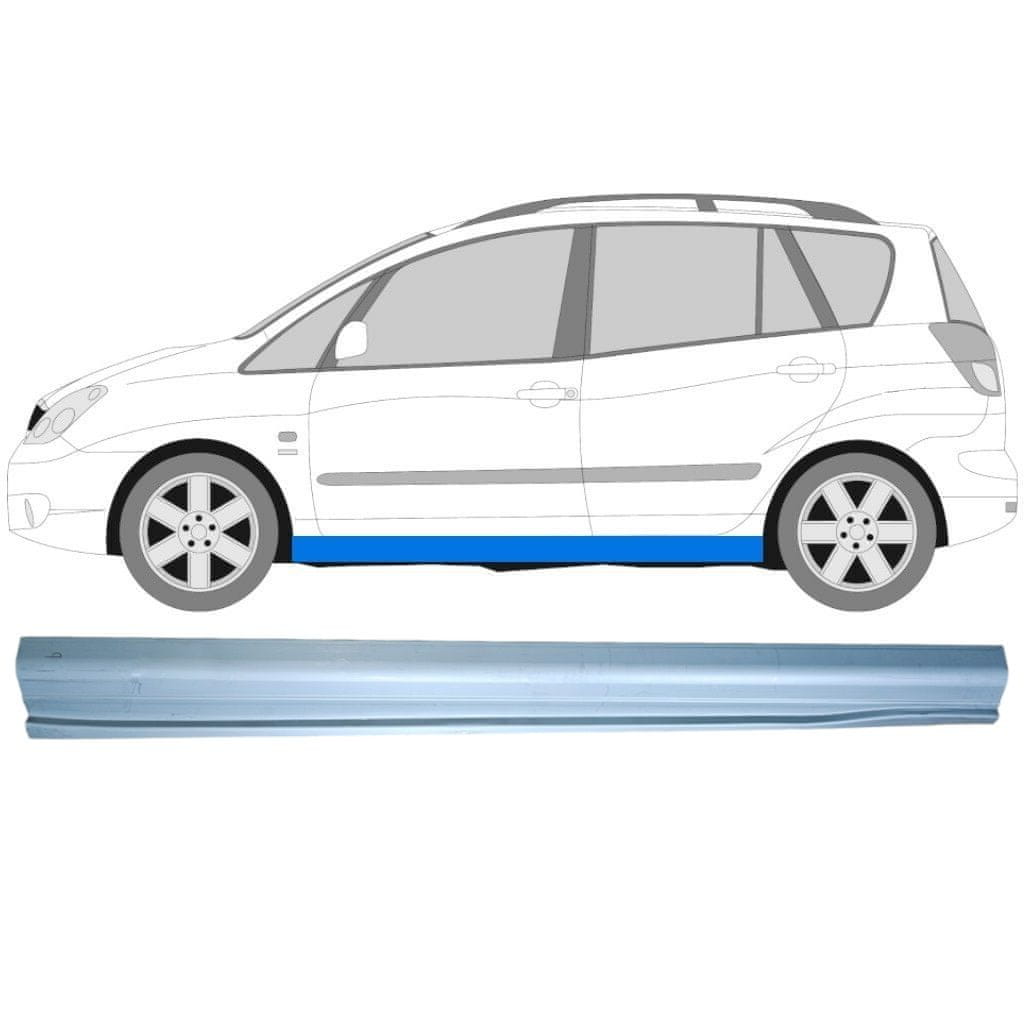 Lim praga za Toyota Corolla Verso 2001–2004 / Lijevo idealan je popravni panel za obnovu oštećenog praga na modelu Toyota Corolla Verso First Generation (AR10). Precizno je oblikovan za vozila godišta 2001–2004, pa se savršeno uklapa na lijevu stranu karoserije bez nepotrebnog prilagođavanja.