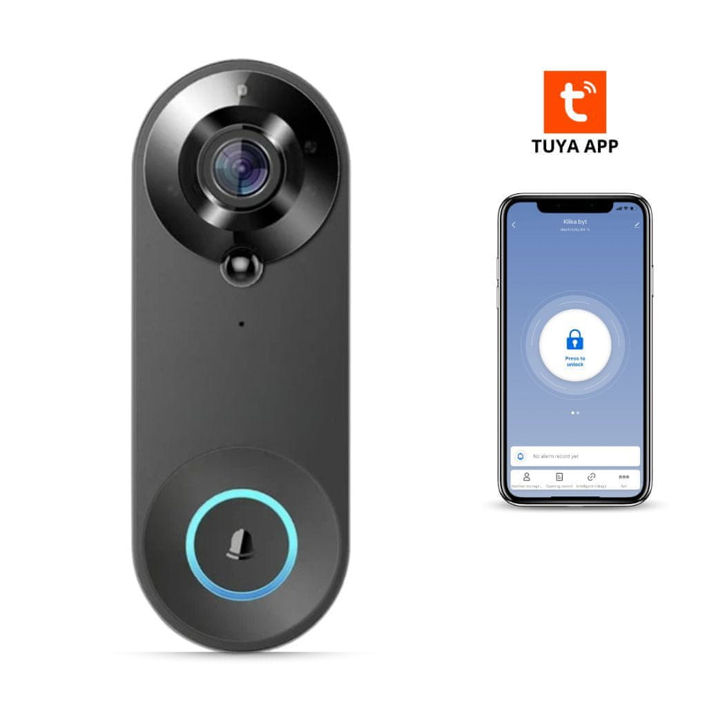 Pametno bežično WiFi zvono na vratima s kamerom s kutom gledanja od 160°, Full HD rezolucija (1080p), vanjska i unutarnja upotreba, detekcija pokreta, dvosmjerna daljinska komunikacija, obavijesti putem telefona, napajanje baterijom, podrška za Android i iOS, Tuya Smart / Smart Life aplikacija, crna Cijeli opis