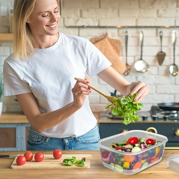 Set posuda za hranu je rješenje za organizirano skladištenje namirnica u hladnjaku, zamrzivaču i kuhinji. Modularni dizajn omogućuje uštedu prostora, dok hermetički poklopci pomažu u održavanju svježine proizvoda, štiteći ih od vlage, zraka i štetnika. Set se sastoji od 5 posuda različitih kapaciteta: 1× 2400 ml, 2× 400 ml i 2× 600 ml. Izrađene od materijala bez ftalata i BPA, posude su sigurne za zdravlje i trajne. Njihova lagana konstrukcija čini ih praktičnima za upotrebu, a transparentne stijenke olakšavaju brzo pronalaženje pohranjene hrane.