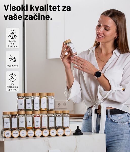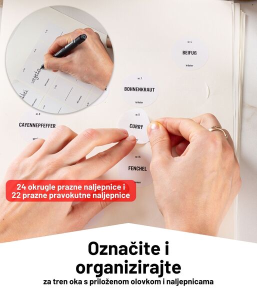 Ne dobivate samo 12 izvrsnih posudica za začine, već cijeli komplet u kojem ćete pronaći sve što vam je potrebno. Uključeno je 48 unaprijed tiskanih okruglih naljepnica s nazivima začina na njemačkom jeziku, 48 unaprijed tiskanih pravokutnih naljepnica s nazivima začina na njemačkom jeziku, 24 prazne okrugle naljepnice i 22 prazne pravokutne naljepnice.