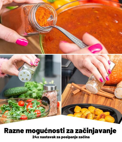 U našem kompletu dobivate dvije verzije poklopaca za posipanje (po 12 komada), tako da možete odabrati sustav doziranja koji je prikladniji za sadržaj pojedine posudice. Naravno, posudice možete koristiti i bez poklopca za posipanje.