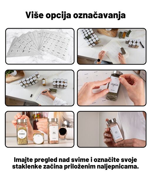 Uz ove staklenke za začine nudimo i odgovarajući stalak za začine, kojim možete organizirati svoju radnu površinu ili ormarić s začinima.