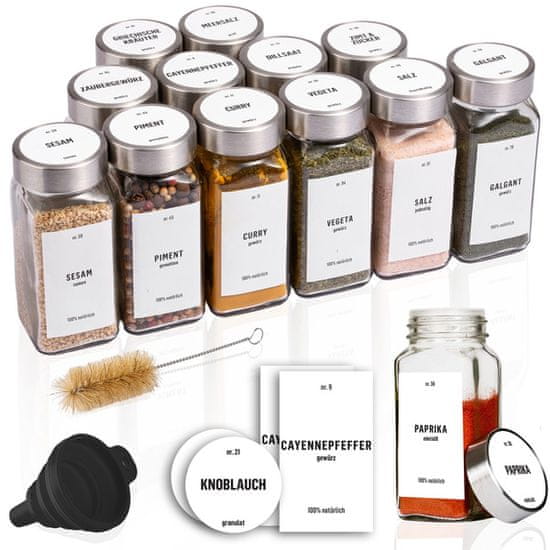 Ne dobivate samo 12 odličnih staklenki za začine, već cijeli komplet u kojem ćete pronaći sve što vam treba. Uključeno je 48 unaprijed otisnutih okruglih naljepnica s imenima začina na njemačkom, 48 unaprijed otisnutih pravokutnih naljepnica s imenima začina na njemačkom, 24 prazne okrugle naljepnice i 22 prazne pravokutne naljepnice.