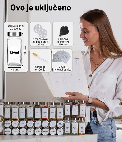 Naš komplet sadrži 36 jednako velikih posudica za začine s praktičnim navojnim poklopcem. Od sada možete njima ponosno izložiti svoje začine koji će vašoj kuhinji dati poseban šarm!