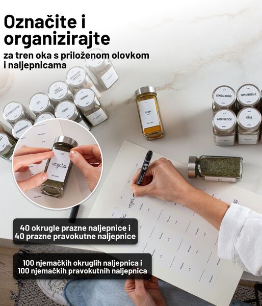 Ne dobivate samo 36 izvrsnih posudica za začine, već cijeli komplet u kojem ćete pronaći sve što vam je potrebno. Uključeno je 100 unaprijed tiskanih okruglih naljepnica s nazivima začina na njemačkom jeziku, 100 unaprijed tiskanih pravokutnih naljepnica s nazivima začina na njemačkom jeziku, 40 praznih okruglih naljepnica i 40 praznih pravokutnih naljepnica na koje možete pisati priloženim visokokvalitetnim krednim markerom.