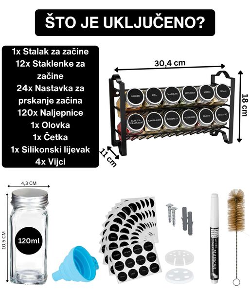 Ovaj set sadrži kuhinjski stalak, ljepljive podloge, 12 staklenki, 48 etiketa, kist, kredni marker, dva posipača, lijevak i materijal za montažu.