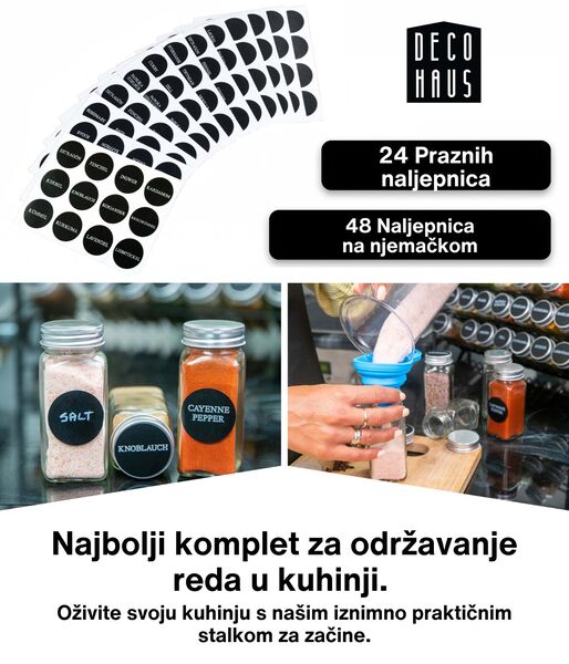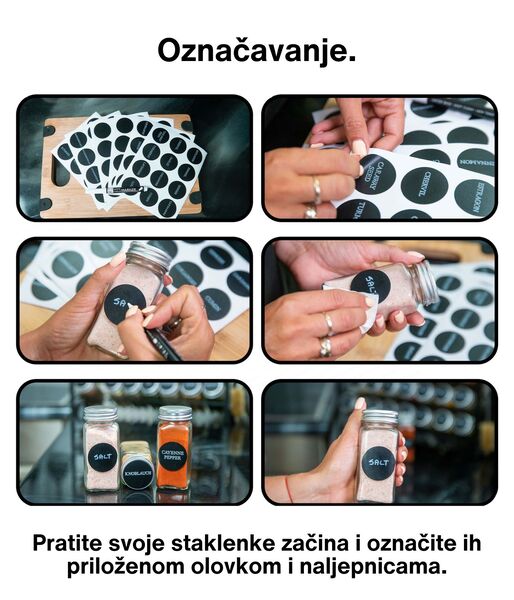 Naš stalak za začine dolazi potpuno sastavljen – tako da možete odmah početi s organizacijom. Kako bismo vam olakšali početak, set uključuje 48 etiketa, od kojih je polovica već unaprijed ispisana. Druga polovica je prazna, savršena za vaše domaće začine i mješavine.
