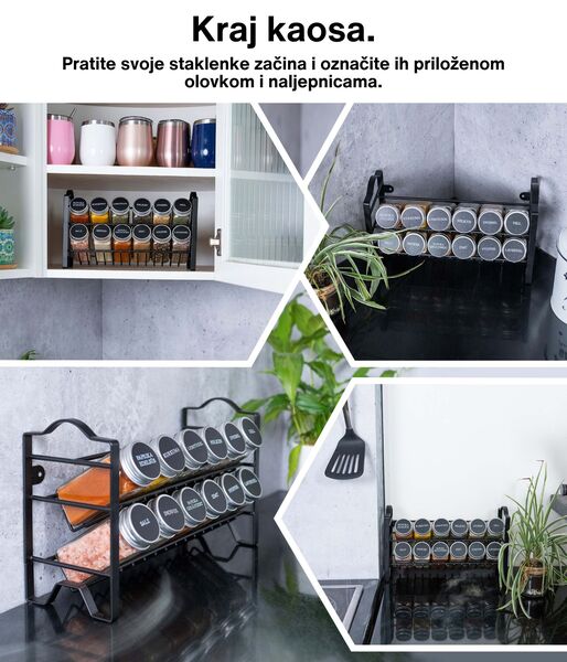 Bez obzira jeste li kuhar koji koristi samo nekoliko provjerenih začina ili volite miješati i kombinirati razne začine, kod nas ste na pravom mjestu! Pohranite sve svoje začine u 12 zasebnih staklenki. Rasporedite ih po želji na dvoslojnom sustavu za organizaciju. Budući da su posude izrađene od prozirnog stakla, ne morate nagađati što se nalazi unutra niti provjeravati trebate li ići u supermarket po novu zalihu.