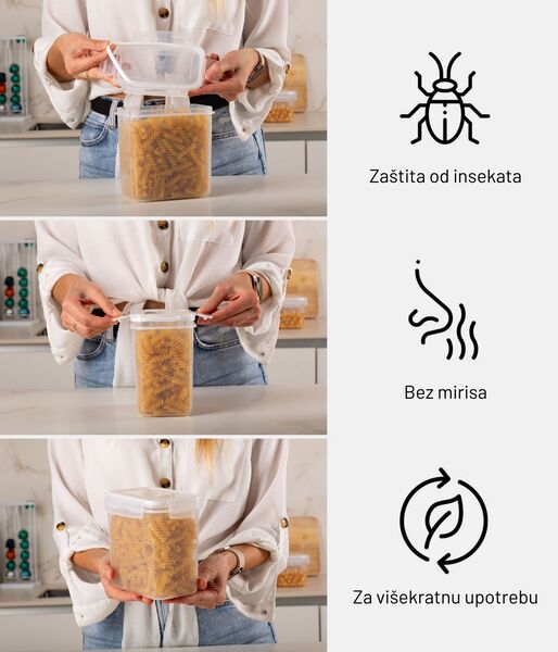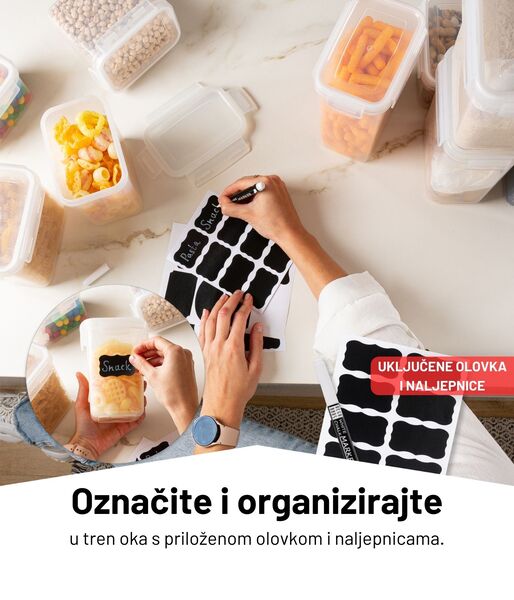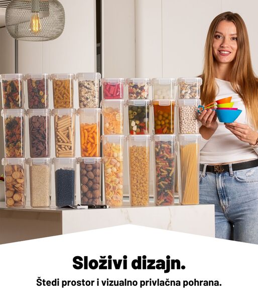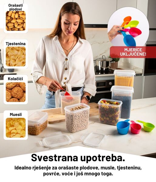 Naš komplet idealan je za pohranu grickalica poput slatkiša, granole, orašastih plodova i keksa, osnovnih namirnica poput brašna te namirnica za doručak poput kave. Pohrana u ovim prozirnim posudama jednostavna je, hrana će biti dobro organizirana i uvijek pri ruci. Nikad više nećete zaboraviti gdje ste nešto pohranili!