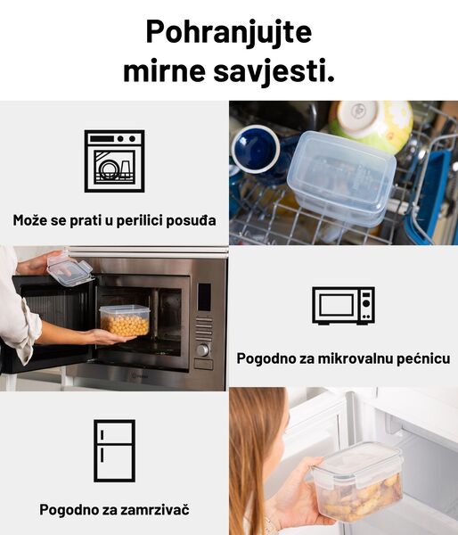 Zahvaljujući silikonskom brtvenom prstenu poklopca, posuda je potpuno nepropusna za zrak. Tekućine ili sokovi ne mogu curiti ili se proliti čak ni kada premještate posude, a hrana ostaje svježa dulje vrijeme.