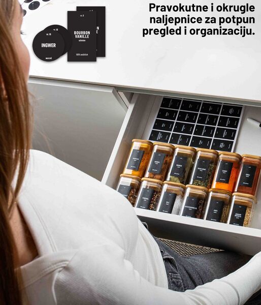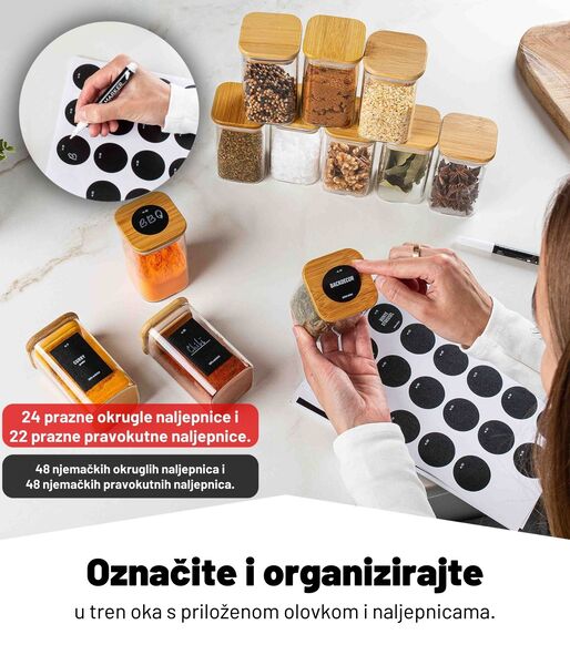 OZNAČITE HRANU – U našem kompletu staklenki s bambusovim poklopcem dobit ćete i 96 naljepnica na njemačkom jeziku te 46 praznih naljepnica kako biste se još bolje organizirali. Dodajemo i kredni marker kojim možete napisati nazive namirnica pohranjenih u staklenkama.