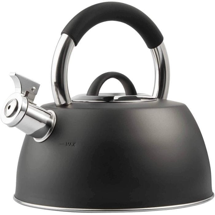 Satenasto crna kuhalnica od nehrđajućeg čelika, 2,2L, s ergonomskom drškom i otpornosti na koroziju. Pogodna za sve vrste kuhalnih ploča.