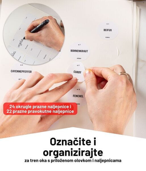 Ne dobivate samo 12 izvrsnih posudica za začine, već cijeli komplet u kojem ćete pronaći sve što vam je potrebno. Uključeno je 48 unaprijed tiskanih okruglih naljepnica s nazivima začina na njemačkom jeziku, 48 unaprijed tiskanih pravokutnih naljepnica s nazivima začina na njemačkom jeziku, 24 prazne okrugle naljepnice i 22 prazne pravokutne naljepnice.