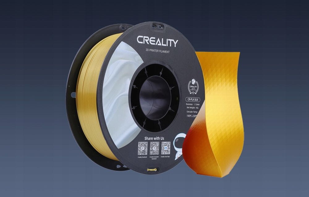Crealityjev filament CR-Silk ima kovinski, elegantan sijaj, zbog zadarja idealan je za zamašne figure, ukrase i cijeli nakit. Odlikuje ga uštravljivost, svrsishodnost uz žvoji předrovanov Creality ter izlaže iz ekoloških materijala.