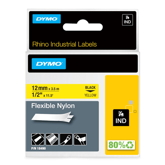 Fleksibilna najlonska traka Dymo RHINO 18490, 12 mm x 3,5 m, crni ispis na žutoj podlozi. Namijenjena za označavanje kabela i neravnih površina. Kompatibilna s uređajima Dymo Rhino i 3M PL.