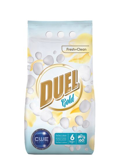 Prašak za pranje Duel Gold Fresh + Clean odlično pere rublje i pri niskim temperaturama. Pakiranje sadrži 6 kg praška.