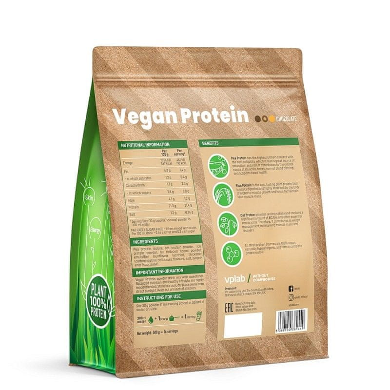 VPLab veganski proteini s okusom čokolade mješavina su 3 biljna izvora proteina – proteinski prah graška, zobi i riže. Pakiranje je dovoljno za 16 porcija: