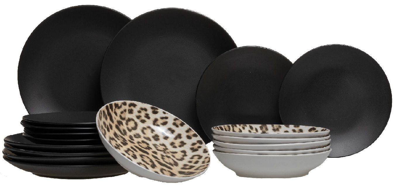 - Set sadrži 6 crnih plitkih tanjura promjera 27 cm, 6 crnih desertnih tanjura promjera 19 cm, 6 leopard zdjela za juhu promjera 20 cm.