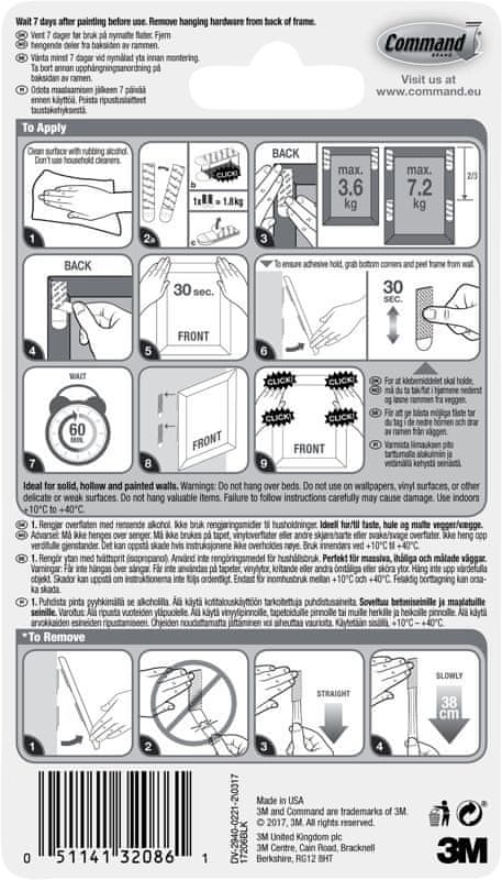 Želite li lijepe interijere, ali ne želite ili ne možete bušiti i kovati nokte? Sustav za lijepljenje zidnih okvira 3M COMMAND rješenje je za vas. Jedna traka veličine 1,9 × 9,3 cm može nositi do 7,2 kg, što je idealno ne samo za slike, već i za oglasne ploče ili ploče za suho podmazivanje. Trake su jednostavno pričvršćene, a zatim uklonjene bez traga, poput ispucale žbuke ili zaostalog ljepila.