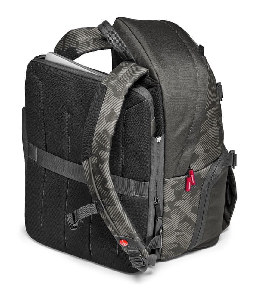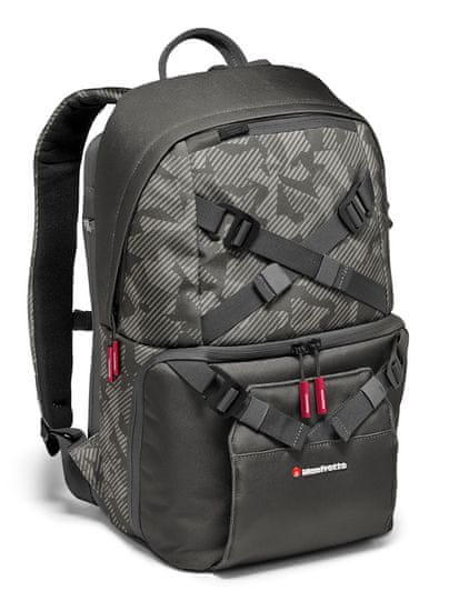 Za vaš mir, ruksak je opremljen Manfrotto zaštitnim sustavom, koji jamči zaštitu vaše opreme od udaraca. Nosač za stativ sprijeda omogućuje vam da uvijek sa sobom imate putni stativ. Džep i elastična uzica sa strane postavljeni su za selfije kako biste zabilježili svoje avanture dok hodate s kamerom od 360 stupnjeva. Bez obzira koju opremu ponesete sa sobom, vaša torba je savršeno rješenje za nošenje! Svojim elegantno decentnim izgledom, savršen je suputnik za vaše svakodnevne avanture! Materijali i detalji odabrani su s velikom pažnjom: kamuflažna tekstura i isprepleteni remeni snažno karakteriziraju ovu torbu. Ona redefinira vrlo prepoznatljiv novi osobni urbani stil. Sva vanjska tkanina tretirana je vodoodbojno, a dostupna je i navlaka za kišu za ekstremne vremenske uvjete.