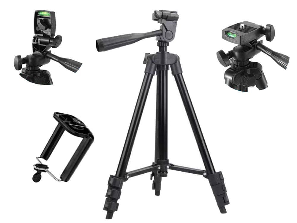 Stativ ima univerzalni navoj za fotoaparate i fotoaparate te držač za telefon. Opremljen teleskopskim nogama s četiri razine podešavanja visine. Čvrsta konstrukcija osigurava stabilnu i glatku sliku. Visina stalka je od 32 cm do 100 cm.