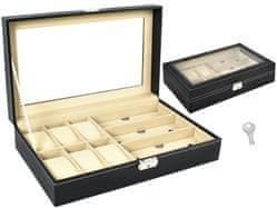 Elegantna kutija ima 3 pretinca za naočale i 6 pretinaca za satove, u koje možete staviti i drugi nakit. Kućište ima elegantnu crnu boju i bijele šavove, što cjelini dodaje eleganciju i stil. Poklop kućišta je proziran, što omogućuje da se kutija za satove i naočale koristi ne samo za pohranu i održavanje reda, već i za elegantno izlaganje sadržaja.