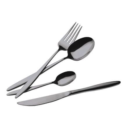 - Materijal: Nehrđajući čelik s poliranom završnom obradom – Set uključuje: – Nož 6 kom 7,0 mm – Vilica 6 kom 4,0 mm – Žlica 6 kom 4,0 mm – Čajna žličica 6 kom 2,7 mm – Boja: crna – elegantan dizajn.