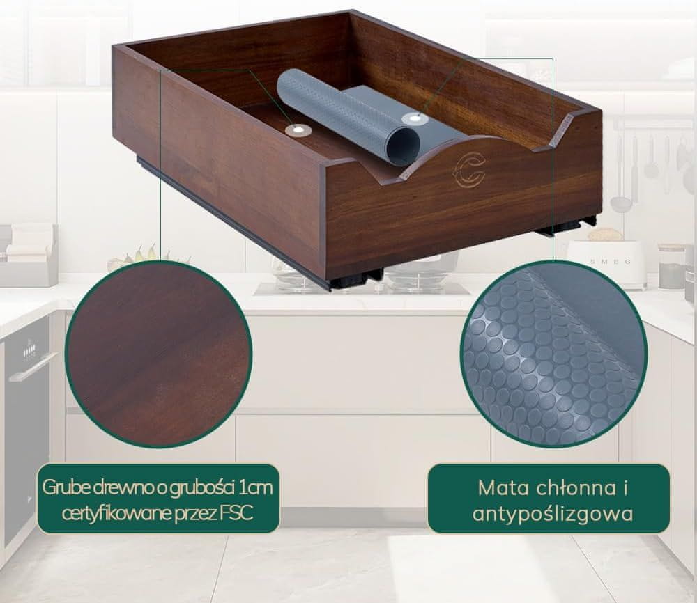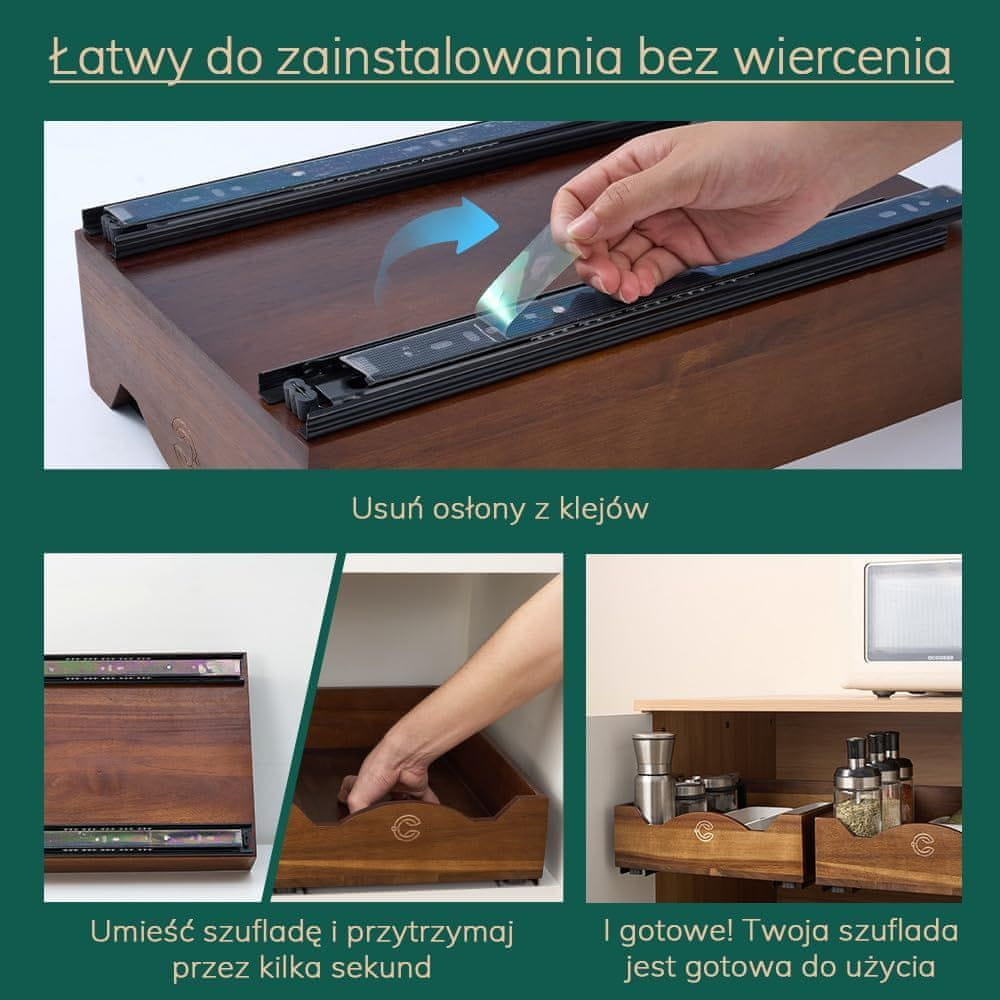 Unesite red i prirodnu eleganciju u svoje ormariće zahvaljujući polici na izvlačenje izrađenoj od certificiranog drva akacije. Ovaj ekološki organizator spaja jedinstveni vintage stil s modernom funkcionalnošću, omogućujući trenutni pristup duboko skrivenim začinima ili kuhinjskim dodacima. Zahvaljujući primjeni inovativne montaže pomoću samoljepljivih traka, možete uživati u novom prostoru za pohranu bez upotrebe bušilice i oštećivanja namještaja. Čvrsta konstrukcija od drva akacije u kombinaciji s tihim vodilicama osigurava nesmetan rad čak i pod velikim opterećenjem, što ladicu čini idealnim rješenjem za prostor ispod sudopera, kuhinjski ili kupaonski ormarić. Ovo je praktičan korak prema održivom domu koji maksimalno koristi svaki centimetar vaše površine uz zadržavanje najviše estetike izrade tijekom svakodnevne uporabe u kućanstvu.