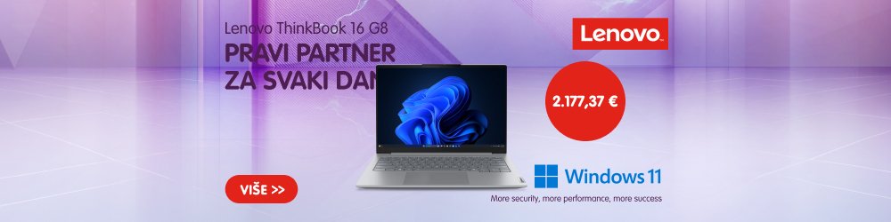 Prijenosno računalo Lenovo ThinkBook 16 G8 opremljeno je tehnološki naprednim i inovativnim rješenjima koja omogućuju besprijekoran rad i sigurno korištenje. Pokreće ga snažan Intel® Core™ Ultra 7 255H procesor, a integrirana Intel® Arc™ 140T grafika pruža vrhunsko grafičko iskustvo. Ima ugrađen zaslon rezolucije 40,64 cm (16") WUXGA (1920×1200). Munjevito brzi SSD pogon kapaciteta 1 TB u kombinaciji sa 16 GB radne memorije osigurava vrhunsku multitasking i izvrstan odziv prijenosnog računala. Instaliran je operativni sustav Windows 11 Pro.