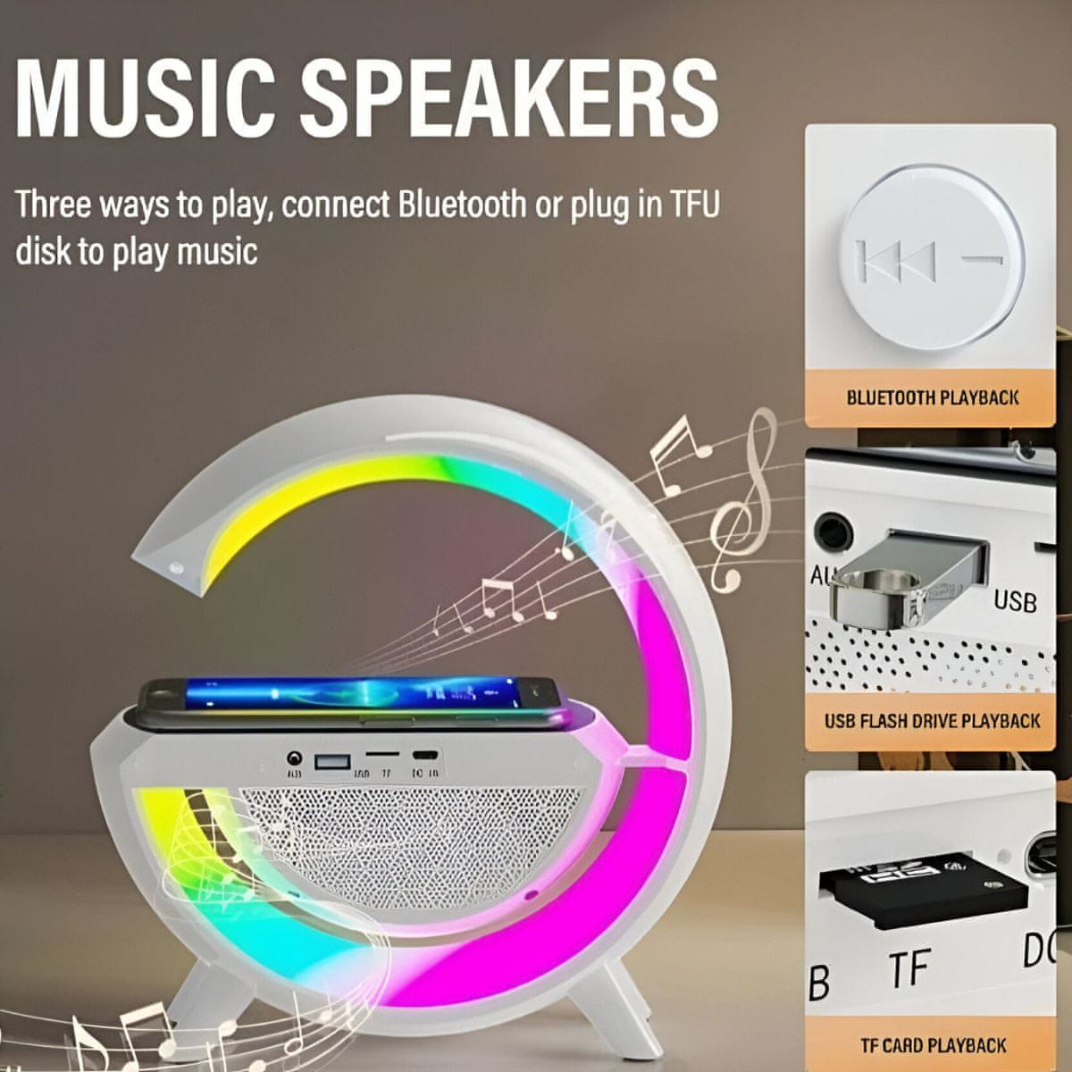 Otkrijte svestranost višenamjenske svjetiljke s Bluetooth zvučnikom, QI bežičnim punjačem i šarenim RGB LED osvjetljenjem. Ovaj inovativni uređaj kombinira bežično punjenje (10 W), 3D zvuk, radio i microSD player, što ga čini idealnim za svaki interijer.