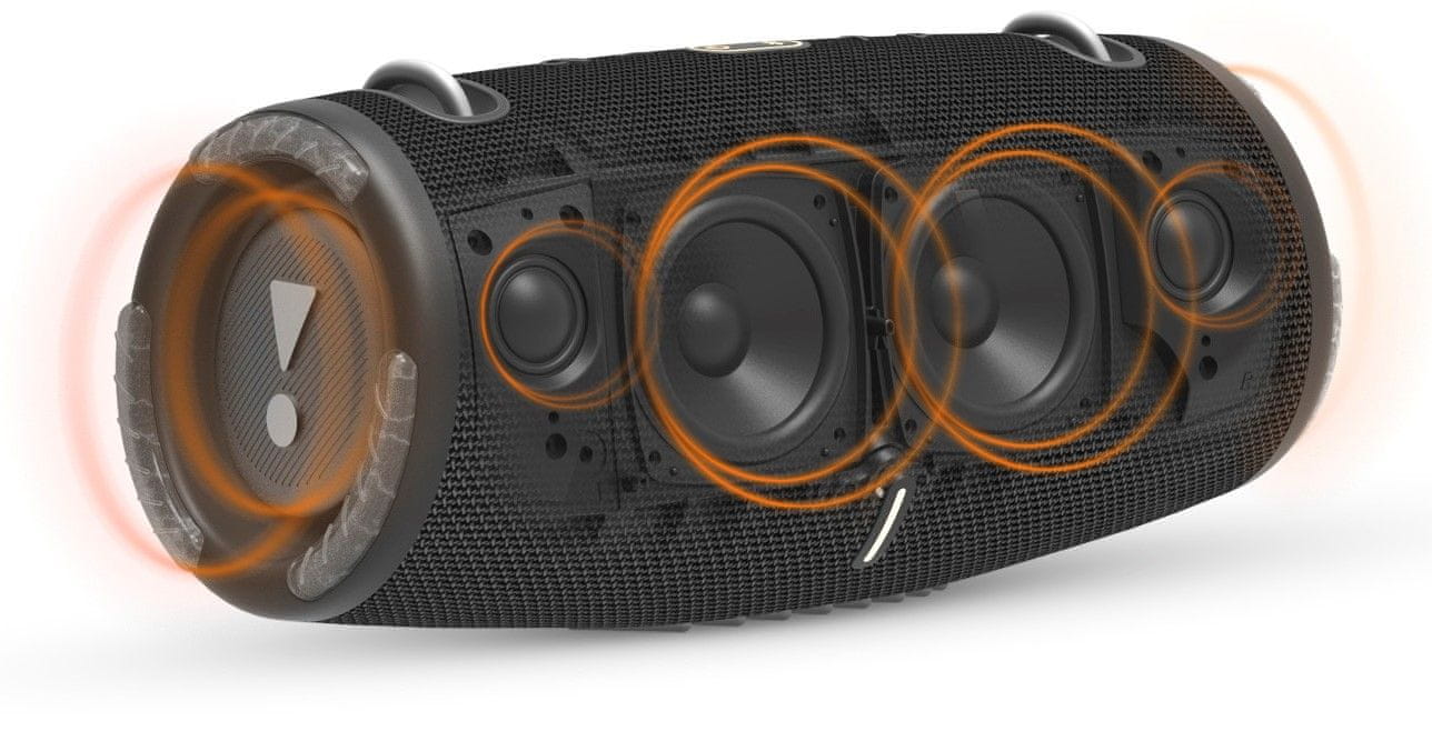 Pripremite nevjerojatno dugačke popise za reprodukciju, jer možete uživati u do 15 sati glazbe uz zvučnik JBL Xtreme 3. Toliko traje s jednim punjenjem, ali pripazite, zahvaljujući funkciji powerbank, može puniti i vaš telefon. Opremljen je subwooferima 2 × 70 mm i visokotoncima 2 × 20 mm, a ukupna efektivna snaga doseže senzacionalnih 100 W. Također se možete veseliti snažnom i dinamičnom JBL Pro Soundu. Za još glasniji zvuk spojite zvučnik na drugu jedinicu prije funkcija PartyBoost. Spojite slušalice s izvorom glazbe putem Bluetooth bežične tehnologije.