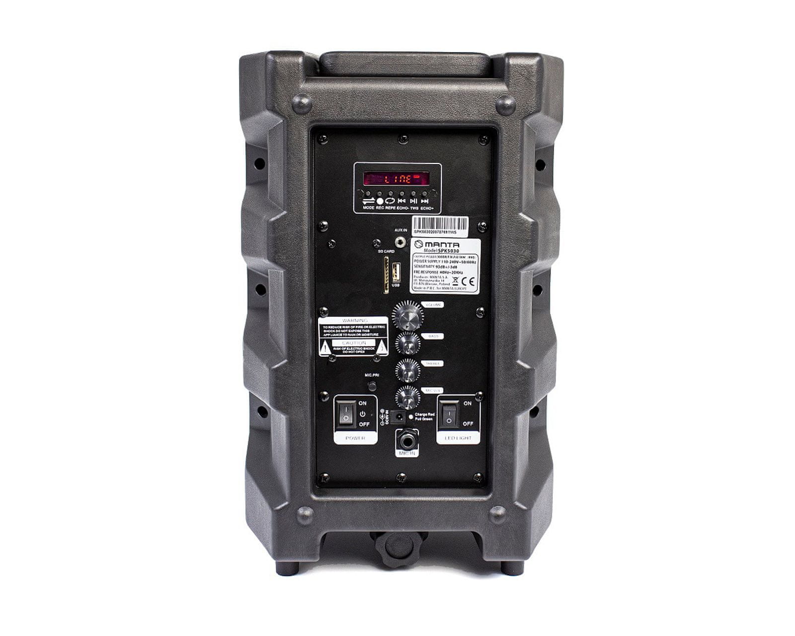 - Karaoke zvučnik MANTA SPK5030 uvijek će pružiti izvrsnu zabavu i raspoloženje u zatvorenom ili na otvorenom i bit će vaš vjerni prijatelj kod kuće, na putovanjima, odmorima, piknicima, priredbama na otvorenom, terasi, vikendu, kampiranju, plaži… bilo gdje, u bilo koje vrijeme.