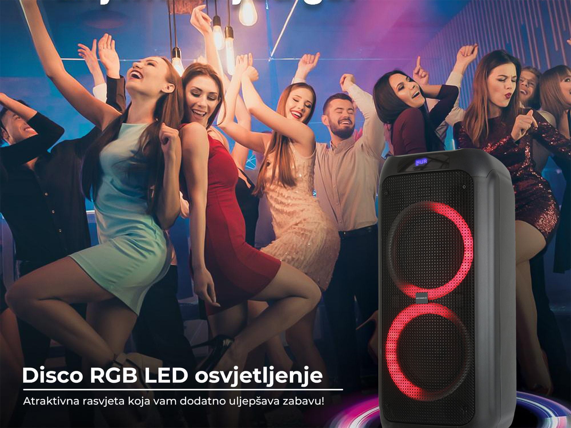 | Drugo | Dva 8″ woofera Bluetooth 5.0 Funkcija TWS (True Wireless Stereo) USB / memorijska kartica / AUX ulaz FM radio Disco LED RGB svjetla (uključeno / isključeno) Super Bass funkcija Ekvilajzer Uključen bežični mikrofon Dva ulaza za mikrofon Konektor za gitaru Možete posebno kontrolirati glasnoću i odjek (ECHO) mikrofona Mogućnost snimanja |