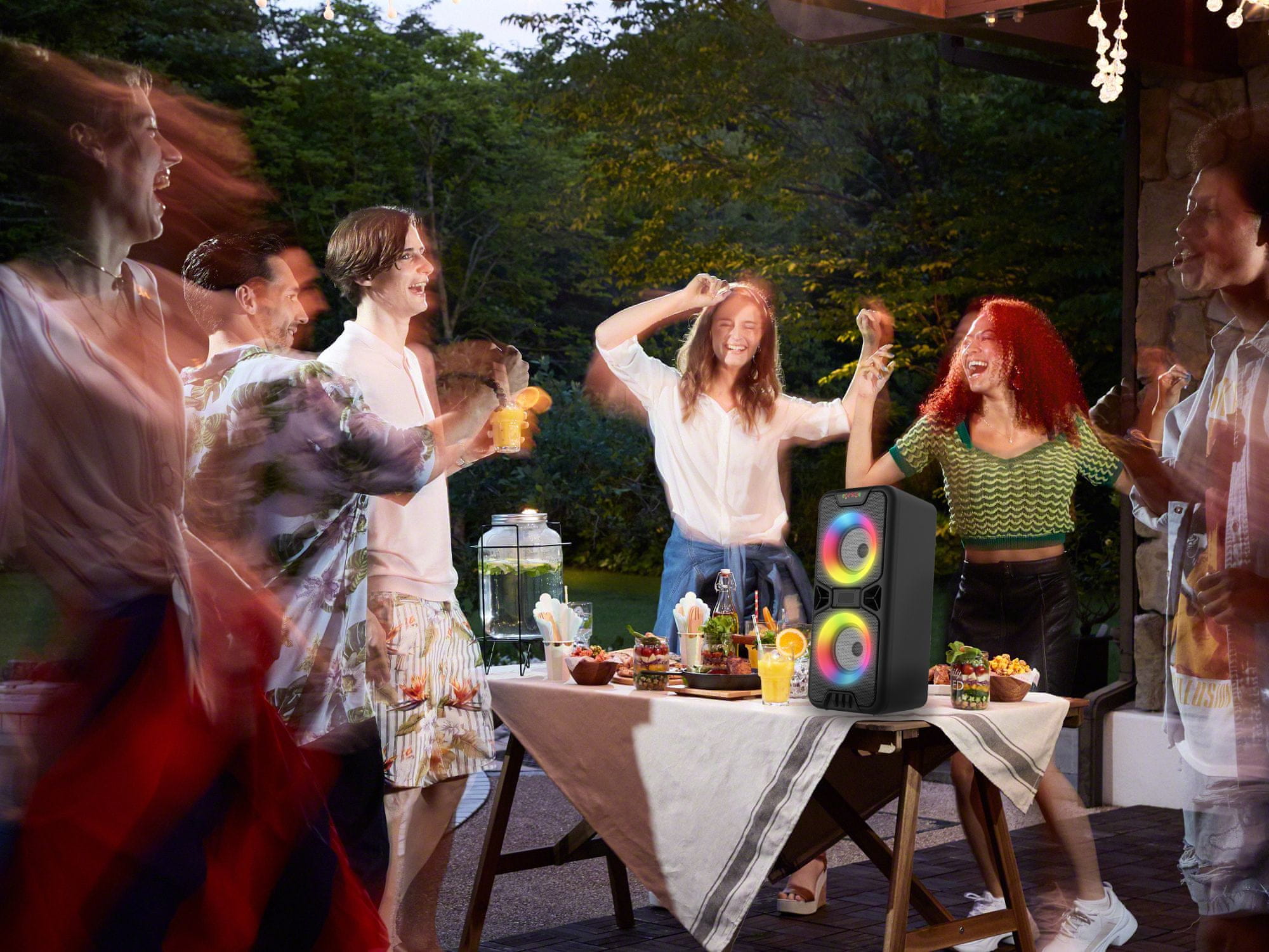 Moderan dizajn zvučnika izvrsno naglašava njegovu prednju stranu gdje su smještena LED svjetla, a na vrhu je upravljačka ploča koja ima tipke za upravljanje i podešavanje. Ugrađena ručka pomoći će vam pri prijenosu, jer možete samo uuzeti zvučnik i odnijeti ga kamo god želite. Zvučnik se također može pohvaliti kompaktnom veličinom, što vam omogućuje da ga lako ponesete sa sobom na izlet ili putovanje, ali kada vam nije potreban, možete ga pohraniti praktički bilo gdje.