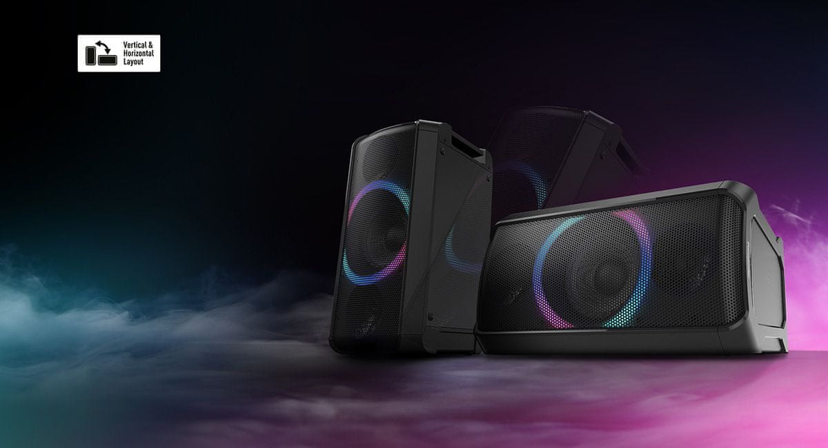 Panasonic SC-TMAX5 može se pohvaliti priloženim prijenosnim napajanjem koje zvučniku omogućuje rad bez uključivanja, tako da ga možete ponijeti gotovo bilo gdje. Omogućuje dva različita izgleda, po želji ga možete postaviti okomito ili vodoravno. Ugrađene ručke osiguravaju lako i bezbrižno nošenje.