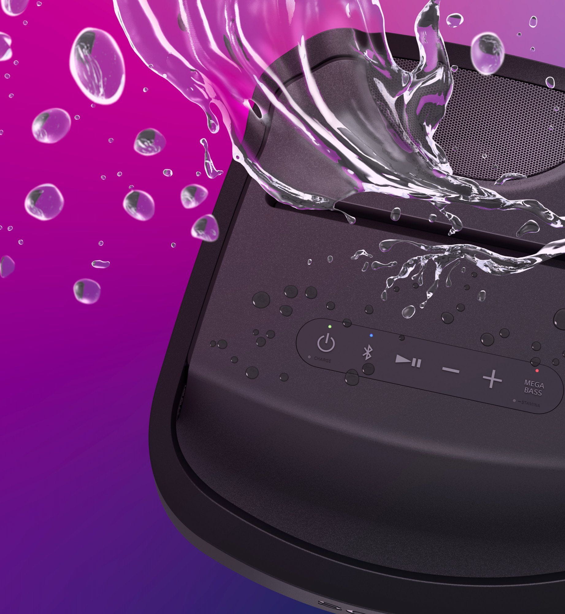 Nema zapreka za organizaciju zabava na otvorenom – zvučnik Sony SRS-XP700 izdržljiv je u tu svrhu i vodootporan je prema standardu IPX4, tako da mu neće naštetiti ni lagana kiša. Ugrađena ručka olakšava nošenje. Instalirana je baterija velikog kapaciteta s radom do 25 sati na eo punjenju. Funkcija brzog punjenja omogućuje vam upotrebu zvučnika još 3 sata nakon samo 10 minuta punjenja. Značajka njege baterije pomaže u zaštiti baterije od prekomjernog punjenja i dulje je održava u savršenom stanju.