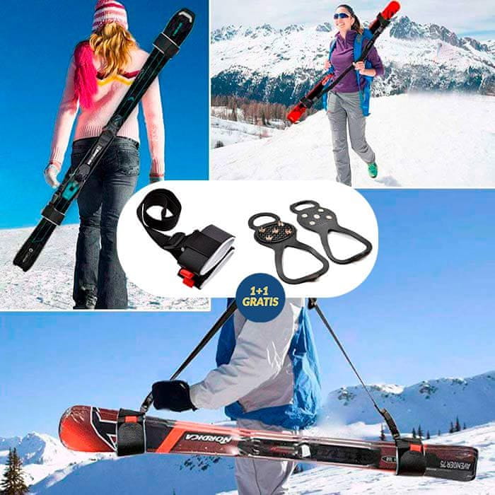 Netscroll Remen za nošenje skija i štapova + univerzalne dereze protiv klizanja, podesiva veličina, za odrasle i djecu, za snijeg i led, SkiBundle