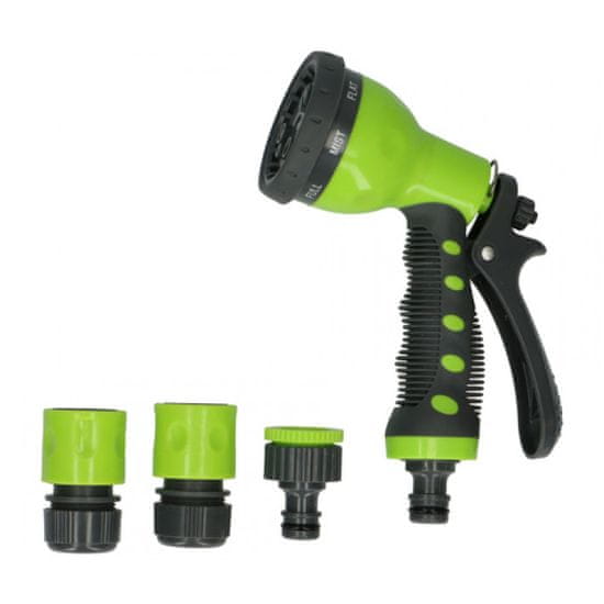 S polugom za podešavanje možete brzo prebacivati između različitih načina prskanja, a posebnom iglom možete zaključati odabrani način rada, čime možete izbjeći nepotrebni zamor ruku, osobito tijekom duljeg korištenja. Set za zalijevanje uključuje: nastavak za slavinu 3/4 pi i reduktor 3/4 ″ –1/2 ″, 2 automatske spojke, pištolj za prskanje.