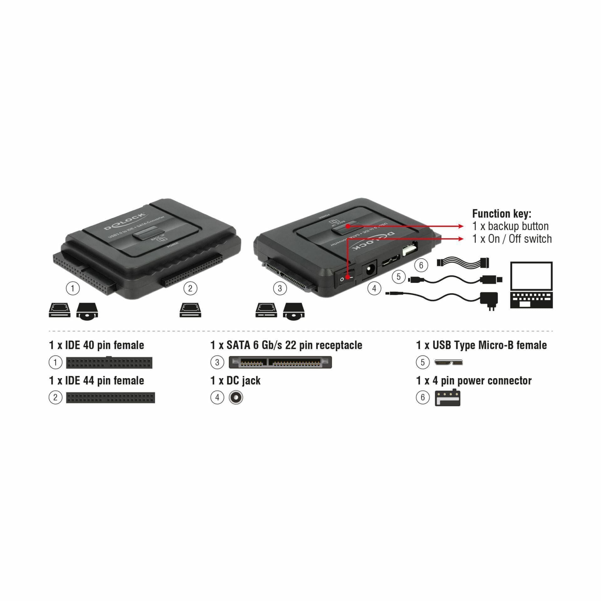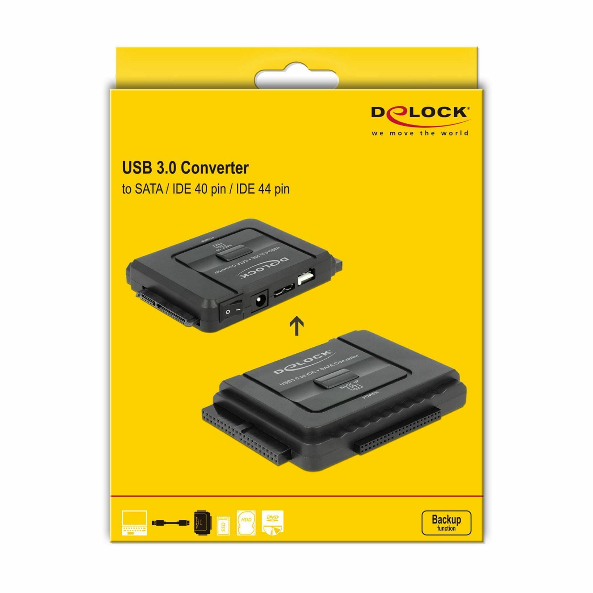 Ovaj pretvarač tvrtke Delock omogućava spajanje 2,5-inčnog ili 3,5-inčnog IDE i SATA pogona na USB ulaz stolnog ili prijenosnog računala. Dakle, može se spojiti na pogon, bez vanjskog kućišta, izravno na USB ulaz. Sadržano napajanje daje električnu energiju pretvaraču i priključenim pogonima. Funkcija pomoćne jedinice omogućava spajanje pomoćnih jedinica stolnog ili prijenosnog računala na priključeni tvrdi disk ili SSD.