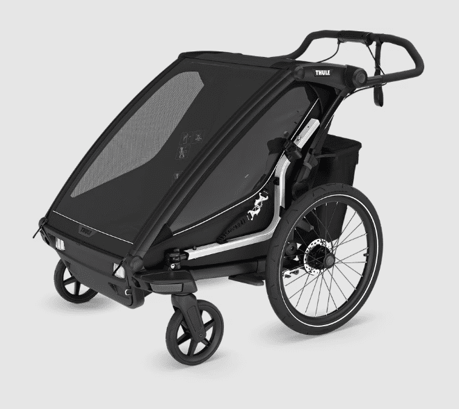 Dizajniran za korištenje tijekom vožnje bicikla, trčanja, hodanja ili skijanja (kompleti za skijaško trčanje i skijaško trčanje prodaju se zasebno). Uključeni navlaka za kišu i krov za sunčanje održavaju vaše dijete suhim i štite ga od sunca.