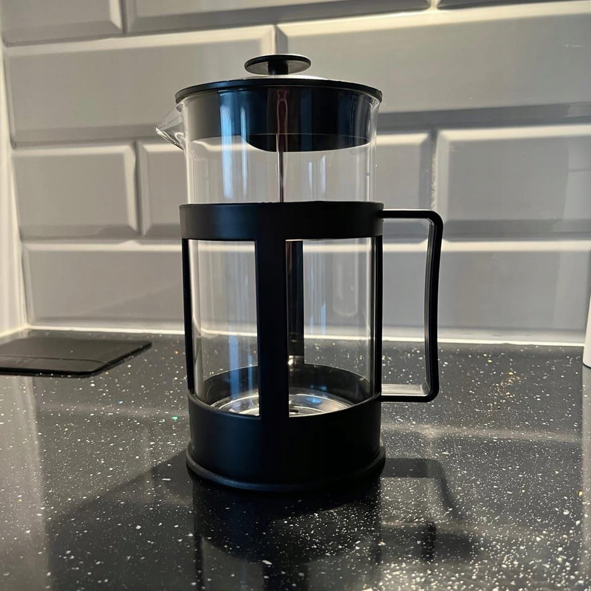 Posuda je izrađena od visokokvalitetnog borosilikatnog stakla koje osigurava otpornost na visoke temperature, a istovremeno je lagana i izdržljiva. Ergonomska ručka osigurava sigurno držanje i lako točenje bez prolijevanja, a filtar od nehrđajućeg čelika sprječava ulazak taloga u vašu čašu. Svojim volumenom od 1000 ml omogućuje pripremu više šalica istovremeno, zbog čega je odličan izbor za druženja s prijateljima ili obitelji.