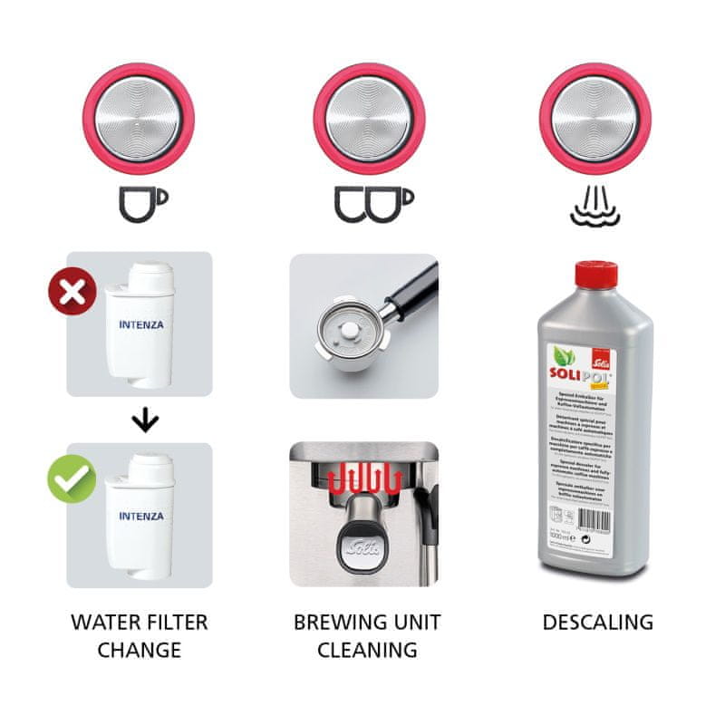 Podsjeća na promjenu filtera za vodu, uklanjanje kamenca i čišćenje jedinice za kuhanje. Uključuje automatske programe čišćenja.