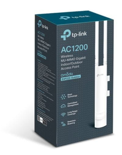 Pristupna točka EAP225-Outdoor prikladna je za vanjsku i unutarnju uporabu. Omogućuje bežične brzine do 1200 Mbps s 2×2 MIMO tehnologijom, a Omada Mesh tehnologija omogućuje bežično povezivanje između pristupnih točaka za veći domet.