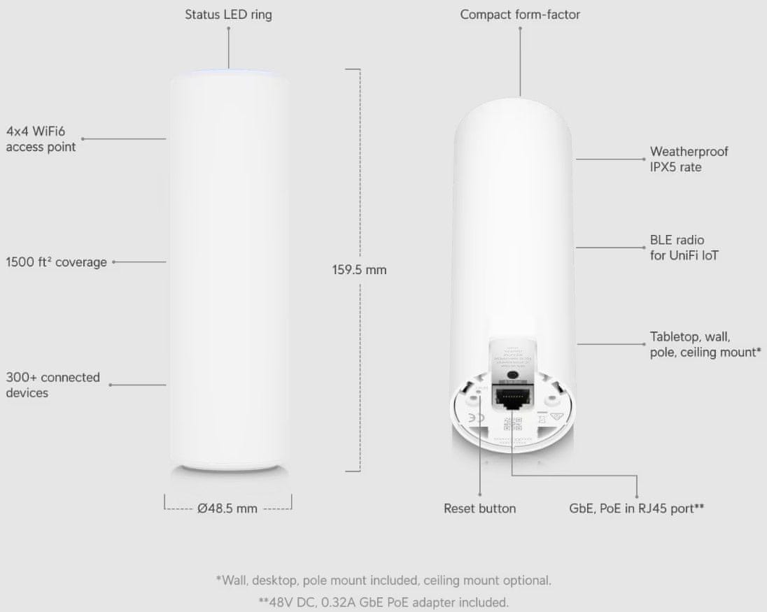 | Hardver | Mrežno sučelje: (1) GbE RJ45 Upravljačka sučelja: Ethernet, Bluetooth Način napajanja: PoE Napajanje: UniFi PoE prekidač; 48 V, 0,32 A PoE adapter (uključen) Podržani raspon napona: 44–57V DC Maksimalna potrošnja energije: 11,4 W Maksimalna TX potrošnja energije: 2,4 GHz – 22 dBm; 5 GHz – 26 dBm MIMO: 2,4 GHz – 2 × 2 (UL MU-MIMO); 5 GHz – 4 × 4 (DL/UL MU-MIMO) Razina propusnosti: 2,4 GHz – 573,5 Mb/s; 5 GHz – 4,8 Gb/s Povećanje antene: 2,4 GHz – 3 dBi; 5 GHz – 5 dBi LED diode: Bijela/plava Gumb Vraćanje na tvorničke postavke: Da Pričvršćivanje: Nosač za zid, stol ili stup (uključen); Montaža na strop (opcionalno) Radna temperatura: –30 do 60° C (-22 do 140° F) Radna vlažnost: 5 do 95 % bez kondenzacije Certifikati: CE, FCC, IC |
